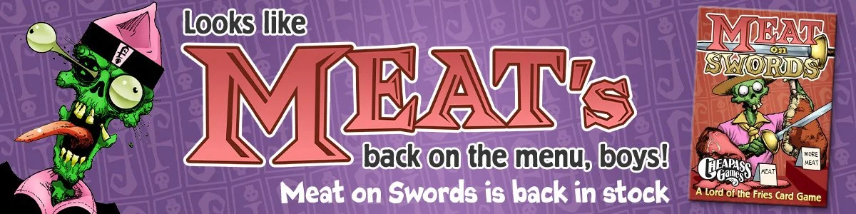 January 15, 2026: Meat on Swords! The first Cheapass Game of 2026 is here. Meat on Swords is a new press-your-luck game in the Lord of the Fries series, with all-new zombie art by Brian Snoddy and Nate Taylor. Read all about it here, buy it at the Shop, and watch the fresh how to play video!
